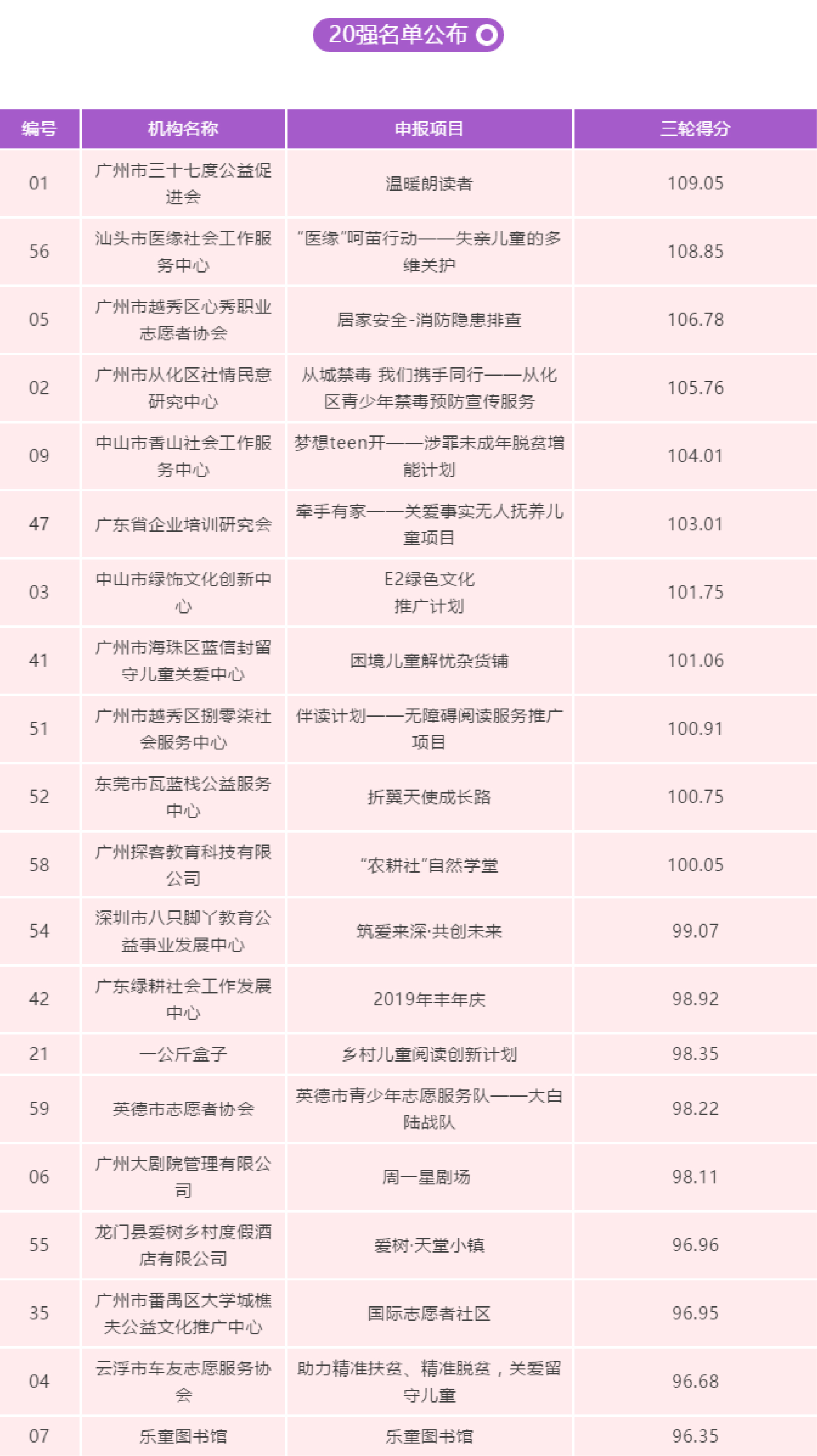 入圍的20強也將在7月27號(本周六)在佛山icc國際商業中心進行地推展演,并最終評選出1個最佳公益項目,3個優秀公益項目,6個新銳公益項目,10個最具成長項目、1個最具創新項目、1個網絡人氣項目、1個最具傳播效應項目。歡迎大家到場支持,共同見證。