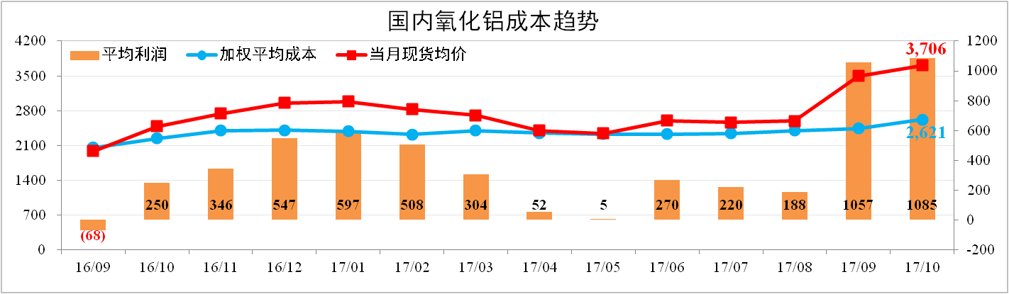 10月份煤炭、鋁土礦及燒堿價格繼續(xù)上漲,導致氧化鋁成本增加。國內(nèi)氧化鋁行業(yè)加權(quán)平均成本漲至2,621元/噸,環(huán)比上漲7.29%。全國氧化鋁現(xiàn)貨成交均價達到3,706元/噸。理論上,氧化鋁行業(yè)平均利潤水平約1,085元/噸。