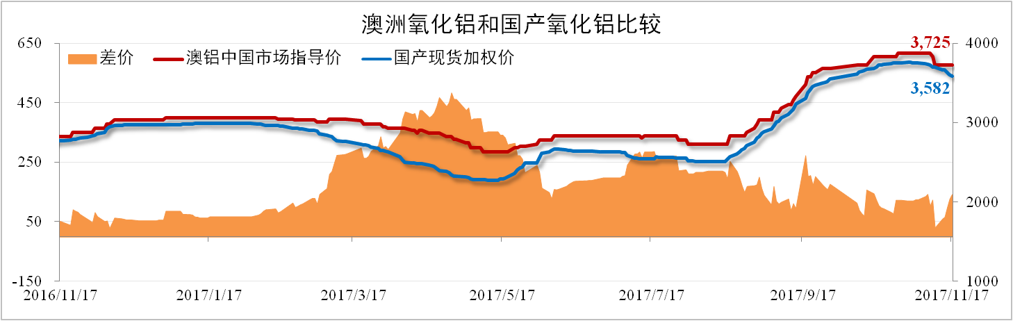 10月份,國產(chǎn)氧化鋁價格上漲幅度過大,進口氧化鋁價格繼續(xù)緩慢跟漲。截止11月17日,澳洲氧化鋁中國市場指導價為3,725元/噸,環(huán)比下降2.61%,國內(nèi)氧化鋁加權(quán)價格3,582元/噸,環(huán)比下降3.20%,價差達到143元/噸。