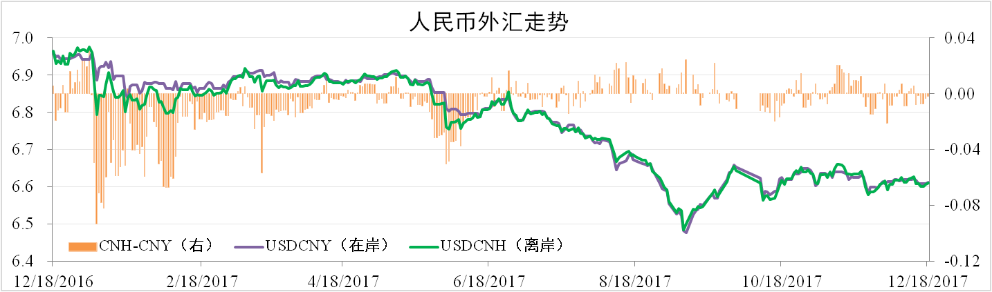 近期人民幣走勢震蕩,總體沒有較大波動。截止12月18日,離岸人民幣報(bào)6.6093,環(huán)比貶值0.4%,在岸人民幣報(bào)6.6111,環(huán)比貶值0.2%。