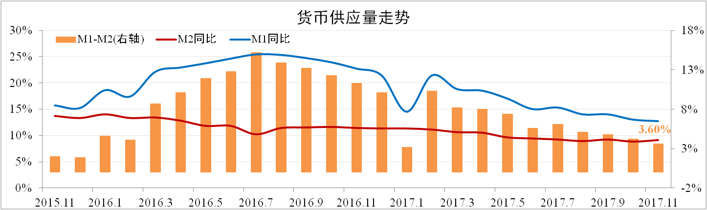 分析認(rèn)為:貸款增加與財(cái)政存款支出增加是M2增長的主要原因。一方面銀行減少非標(biāo)投資轉(zhuǎn)向企業(yè)貸款,另一方面雙十一刺激居民短期消費(fèi)貸增加??紤]到季末效應(yīng)以及信貸投放額度,預(yù)計(jì)12月M2增速有小幅放緩。