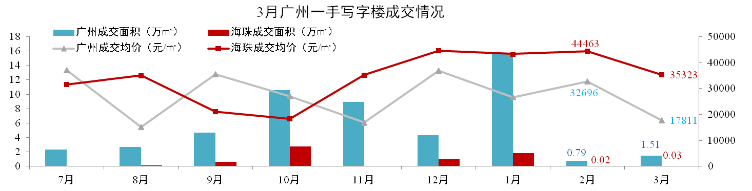 3月,廣州一手寫字樓成交1.51萬m²,環比上升23%,成交均價17,811元/m²,環比下跌36%。其中海珠區成交0.03萬㎡,環比上升50%,成交均價35,323元/㎡,環比下降21%。