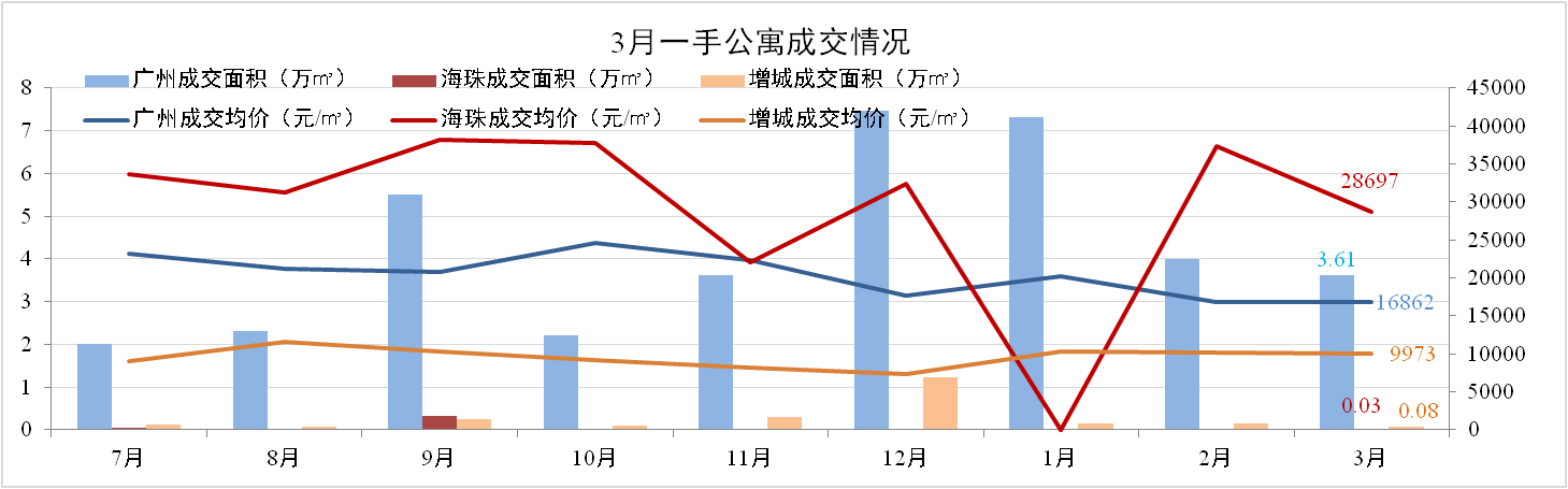 3月廣州一手公寓成交600套,成交面積3.61萬㎡,環比下跌0.3%。全市成交均價16,862元/㎡,環比上升2%。海珠、增城兩區成交量式微,價格保持穩定。