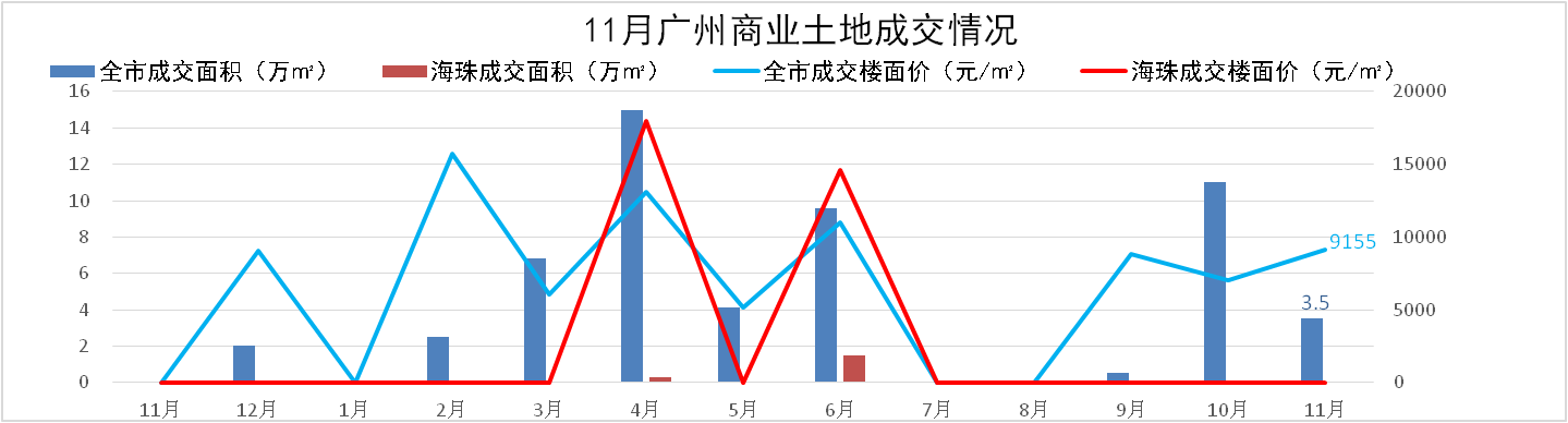 全市:11月共成交2宗商業(yè)地塊,成交面積3.5萬(wàn)㎡,成交樓面價(jià)9,155元/m2,無(wú)溢價(jià);琶洲區(qū)域暫無(wú)土地成交。