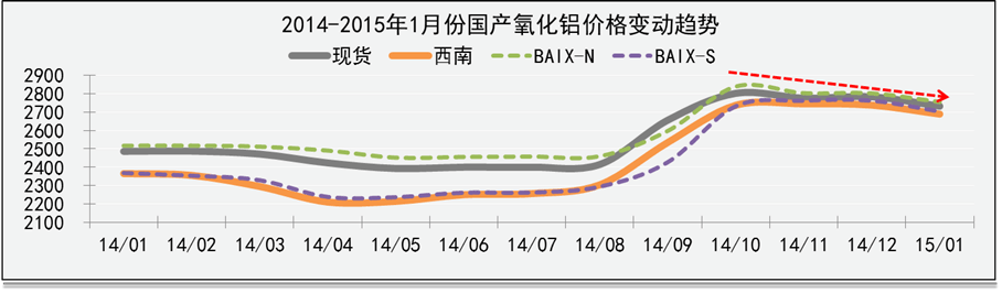 2014年度我國氧化鋁市場價格總體表現為“先抑后揚”的發展趨勢,上半年市場整體延續了2013年度的弱勢,北方地區氧化鋁現貨價格最低滑落至2350元/噸,創造了近四年來的新低。第三季度氧化鋁現貨價格前期較為平穩,后期價格則出現急劇攀升的良好發展趨勢,促使氧化鋁市場價格短期內提升至近三年的高點。第四季度氧化鋁現貨價格又逐步呈現回落趨勢,并于2014年底基本企穩。整體上看,2014年度氧化鋁國產現貨加權價格為2544元/噸,同比上漲1.4%,西南地區均價為2420元/噸,同比上漲2.1%。