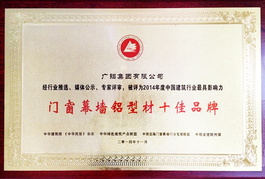 歷時三個多月,2014年度中國建筑行業最具影響力“門窗幕墻鋁型材十佳品牌”評選名單終于在11月份火熱出爐。廣鋁集團憑借雄厚的綜合實力和市場影響力獲此殊榮。