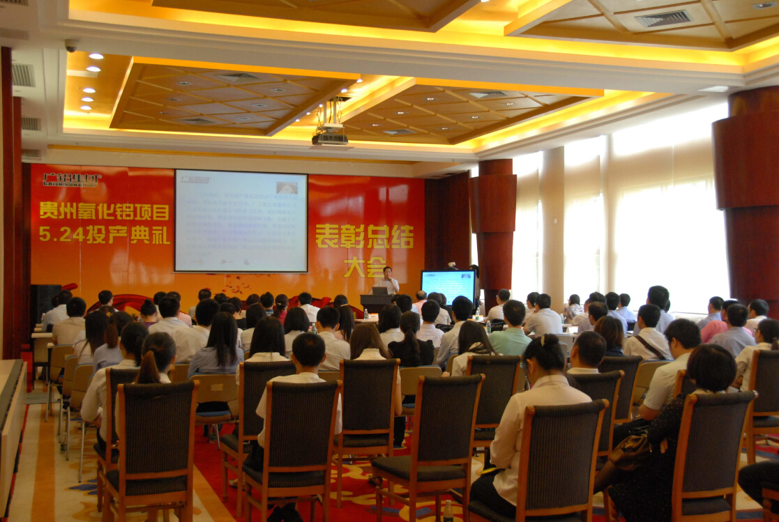 2012年6月9日,廣鋁集團在江高行政辦公樓二樓多功能廳舉行了貴州氧化鋁項目5.24投產典禮表彰總結大會。集團總部及各分公司中高層管理干部、投產典禮所有廣鋁工作人員出席了會議,貴州公司也通過視頻連線參加了本次大會。集團王常務副總裁在會上做了重要講話,大會最后對貴州5.24投產典禮中表現突出的一批工作人員進行了表彰。